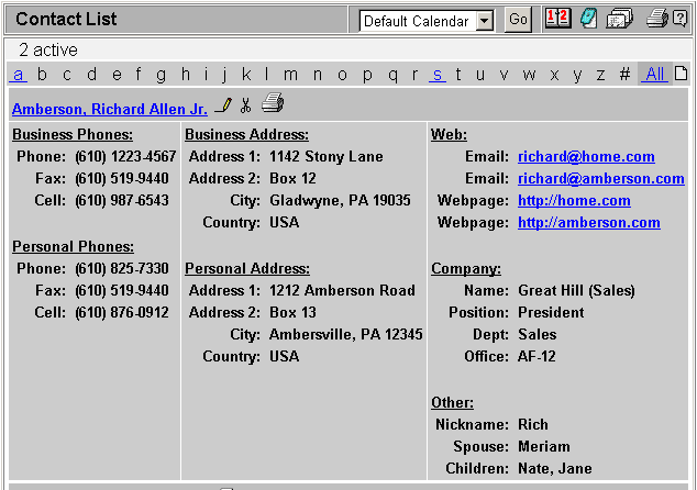 Contact List - Detail View Notice on the left hand menu the item called Details. This item will cause a more detailed view of the contact list data to be displayed. This is what the detail view looks like: