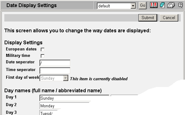 The remainder of this self evident screen is presented without further explanation. You may not enter an empty value for any of these items. Neither may you re-order these values - in particular - you may not enter Monday in the slot for Sunday in an effort to change the first day of the week. The first slot is the name of Sunday, the second for Monday and so on. Take the reset these values to their defaults at the bottom of this screen to reset these values to their defaults. |