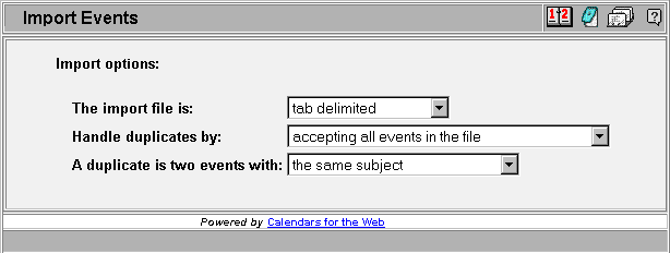 Description This screen allows you to import events from delimited text files. The import is quite flexible, expecting a file in the format described here. The program expects a file called import.txt residing in the calendar folder of the current calendar. The exact name of the expected file will appear on this first screen of the import feature: