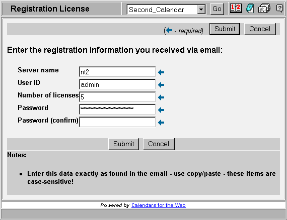 Once you've purchased a password you will receive an email with the information above. Please be careful to enter all items using the proper upper and lower case exactly as represented in your email. Each of these items is case sensitive. Press the Next button to process the registration data. If you successfully entered your registration information you will receive a message similar to the above. Press the Finish button to return to the Administration screen. If you have changed the name of the Registration User the previous Registration User will be removed from the system. A new Registration User will be added with the same password as its user id. If you are simply adding calendar licenses the Registration User will be left unchanged. The Registration user is a special user in that only he/she may add new users and change the registration data. For more information on users please see this help page. |