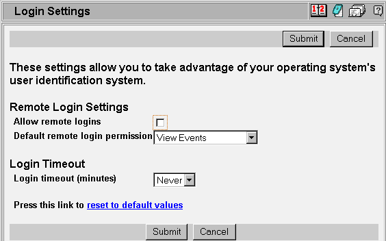 If allow remote logins is not checked the program acquires a user's permission from only one source -- the internal user database. If allow remote logins is checked then if the user has gotten to the calendar web page without having logged in to either the web server or operating system then the user permission is acquired from the user database (as usual). However, if the user has already logged in to the website or operating system the program uses that information. If the user has logged in to the website or OS then if the user is also found in the internal user database then the permission given the user is that found in the database. For example, if a particular user logs in to the website as 'john' then if 'john' is also found in the internal user database and the record in that database is ADMIN then 'john' will be automatically logged in to the calendar with ADMIN permission. If the user has logged in to the website but no corresponding record is found in the internal user database then the default remote login permission is granted this user. Note that this is probably a different permission than the default calendar permission. |