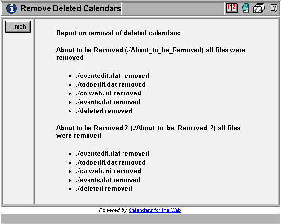 The above confirmation screen will appear when the remove is completed. In some cases not all files found in the calendar folder can be removed (for example any file that was not created by this program). In this case the program will not remove the calendar - you will be notified of this on this screen. Press the Finish button to return to the Calendar Manager. See the Deleting Items help page for more information on deleting and un-deleting items. |