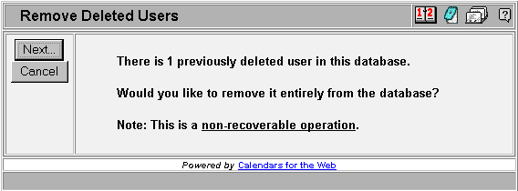 If there are no previously deleted users this screen will inform you of that. If there are previously deleted users you may press the Next button to permanently remove these users. Important Note: This is a non-recoverable operation.