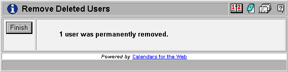 The above confirmation screen will appear when the remove is completed. Press the Finish button to return to the User Manager. See the Deleting Items help page for more information on deleting and un-deleting items. |