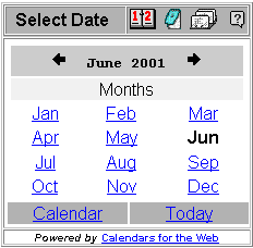 First select the calendar period you would like to work with (either Day, Week, Month or Year) and then select the exact date you are interested in. Press the Calendar link to return to the calendar from which you came (but with the new date). Press the Today link to make the current date the today's date. |