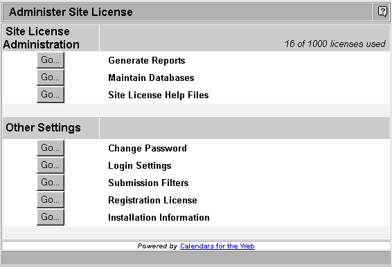 Administering the Site License The Site License Adminstration screen provides access to a few site license specific functions. Only the Registration user can see this screen.