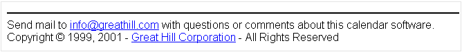 These lines of text may be modified from the Edit Calendar option under the 'Page Footer' section. The Footer may be included in a Display Template by using the following tag: <cw_d object="footer"> It is possible to modify the footer section of the calendar with the Demo version of the software however your modifications will be ignored. Great Hill logos and pointers back to our website will continue to appear until you register the software. |